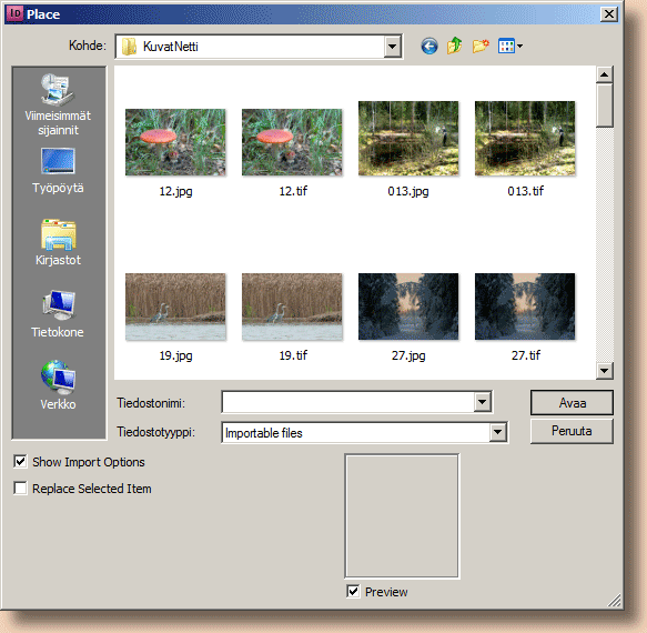 Kuva tuodaan Indesigniin sijoita komennolla: File --> Place: