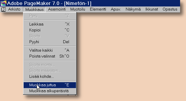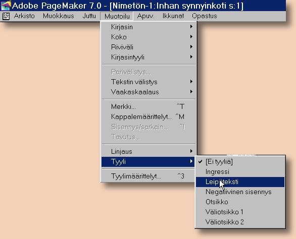 Kun eri tekstityylit on muotoillut, voidaan määritellä, mitä tekstityyliä kukin kappale noudattaa. Toki voidaan nämä toimenpiteet suorittaa päinkin vastaisessa järjestyksessä. Vaikka toimenpide voidaan suorittaa Pagemakerin normaalissa työskentelyikkunassa, on sen tekeminen, ainakin vähänkin isompaan tekstipätkään, helpompaa Pagemakerin teksti-ikkunassa. Avataan se kohdasta Muokkaus --> muokkaa juttua: