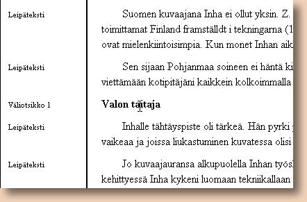 Tämän jälkeen määritellään loput tyylit, viemällä kursori kyseiselle riville ja valitsemalla edellisessä kuvassa olevasta valikosta käytetty tyyli. Huomaa, ettei ole tarpeellista valita koko kappaletta vaan riittää, että kursori sijaitsee kyseisellä rivillä.