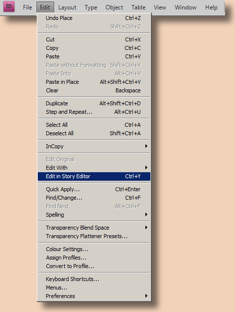 Kun eri tekstityylit on muotoillut, voidaan määritellä, mitä tekstityyliä kukin kappale noudattaa. Vaikka toimenpide voidaan suorittaa Indesignin normaalissa työskentelyikkunassa, on sen tekeminen, ainakin vähänkin isompaan tekstipätkään, helpompaa Indesignin tekstieditorissa. Avataan se kohdasta Edit --> Edit in Story Editor: