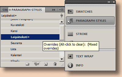 Ja sen jälkeen määritellään tyyli leipätekstiksi Paragraph Styles -ikkunassa. Plusmerkki tyylinimen perässä tarkoittaa sitä, että valinta-alueella on tyylimäärittelyjä, jotka poikkeavat käytetystä tyylistä eli esimerkiksi lihavointeja ja kursivointeja. Jos haluat tyylimäärittelyn yhteydessä poistaa kaikki sellaiset, niin pidä Alt-näppäin pohjassa samalla kun klikkaat käytettävän tyylin nimeä.