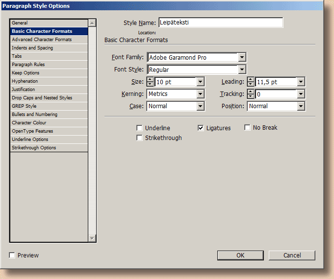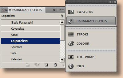 Tekstityyppejä päästään muokaamaan Paragraph Styles -ikkunassa: