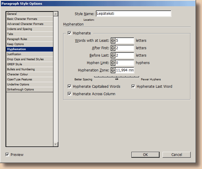 Hyphenation kohdassa määritellään tavutusasetukset. Hyphen Limit tarkoittaa suurinta mahdollista peräkkäisten tavuviivojen määrää. Lopussa määritellään se pyritäänkö vähäiseen tavuviivojen määrään vai hyvään sanojen ja kirjainten välistykseen.
