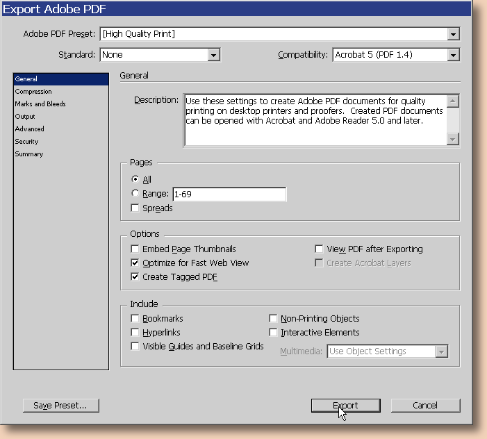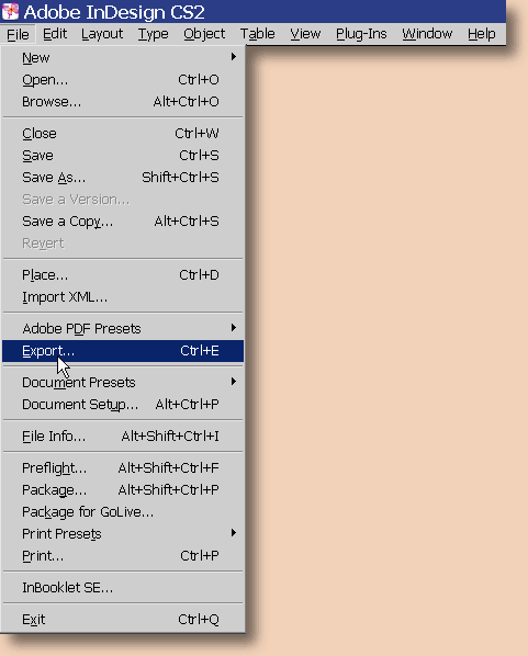 Yksi erittäin käyttökelpoinen ominaisuus Indesignissa on se, että se kykenee tuottamaan pdf-tiedostoja. Pdf-tiedostoihin olet varmaankin törmännyt netissä ja yksi sen käyttömuodoista onkin julkaisujen levittäminen netin välityksellä, mihin toimeen tiedostomuoto on mitä erinomaisin. Sitä voi myös käyttää julkaisun siirtämiseen toiselle koneelle tulostusta varten ja kaikki vähänkin isommat julkaisut kannattaa koetulostaa tekemällä niistä ensin pdf-tiedosto, sillä siinä paljastuvat useimmat dokumentin rakenteelliset ongelmat. Pdf-tiedoston tekeminen aloitetaan valitsemalla File --> Export: