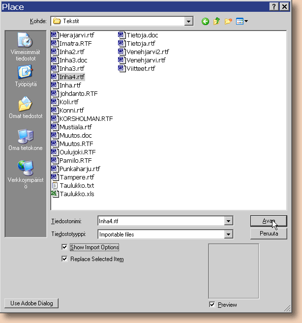 Tekstin sijoittaminen aloitetaan valitsemalla File --> Place: