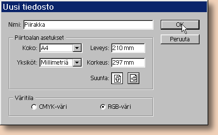 Tässä ikkunassa määritellään työlle nimi, suunta ja koko. Hyvin tärkeä valinta sivun alareunassa on se onko työn väritila CMYK vai RGB. Jos olet tekemässä kuvaa nettiin, valitse kuvan väritilaksi RGB. Jos taas olet tekemässä työtäsi painotuotteeseen tai tulostettavaksi postscript-tulostimelle niin valitse CMYK. Jos joudut työsi tulostamaan tavallisella mustesuihkutulostimella, etkä joudu sitä todennäköisesti koskaan julkaisemaan painotuotteessa tai monistuskoneella kannattanee valita väritilaksi RGB.