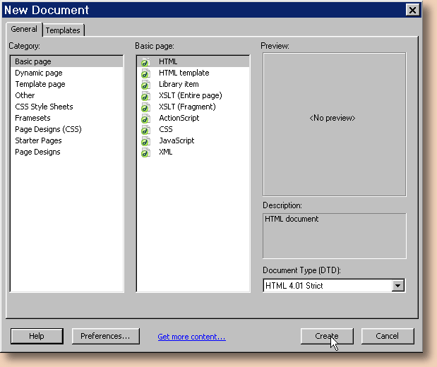 Tässä ikkunassa valitaan erilaisista sivupohjista se, mikä sopii parhaiten uuden sivun pohjaksi. Basic page ja siellä HTML on hyvä lähtökohta normaalille perussivulle. Document Type-kohdassa määritellään, mitä HTML määritelmää sivu noudattaa. Ellei käytä mitään erikoisempia komentoja tällä ei liene hirveästi merkitystä, mitä asetusta käyttää.