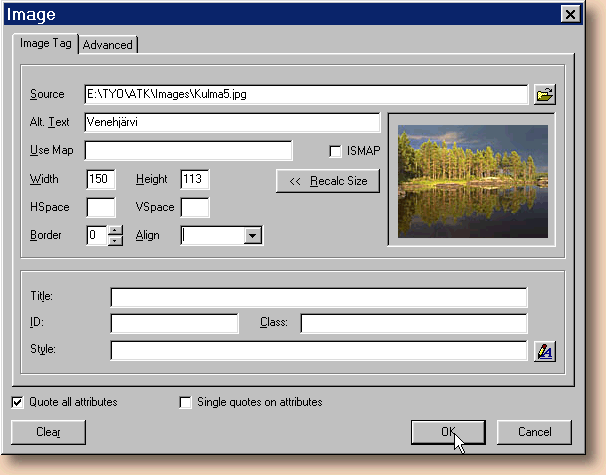 Kohtaan Source tulee kuvan osoite. Huomaa, että ei tule käyttää yllä olevan esimerkin mukaista osoitetta, joka ei enää olekaan voimassa, kun kuva siirretään webbipalvelimelle, vaan tulee tarkistaa, että osoitteeksi tulee sellainen, että se viittaa kuvaan suhteessa siihen missä varsinainenkin webbisivu sijaitsee. Elikä tässä tapauksessa osoitteen tulisi olla muotoa: images/kulma5.jpg.
