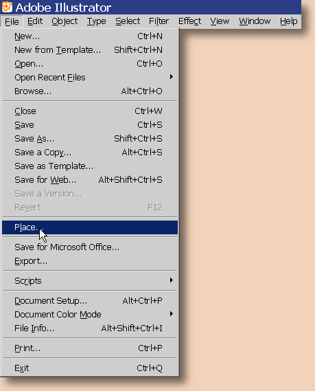 Valokuva sijoitetaan myös tähän ohjelmaan samankaltaisesti kuin Indesigniinkin. Ensiksi valitaan File --> Place: