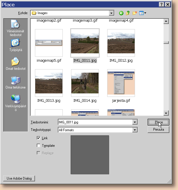 Tässä ikkunassa valitaan sijoitettava kuva ja painetaan Place. Huomioi, että jos vasemmalla on ruksi kohdassa Link, niin Pagemakerin tapaan koko kuvaa ei sisällytetä dokumenttiin vaan vain linkki siihen.