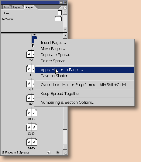 Jos halutaan, että sivupohjan elementit eivät tulostu jollain sivulla (esimerkiksi kansilehdellä), mennään kyseiselle sivulle ja painetaan hiiren oikeaa näppäintä, jolloin aukeaa valikko, josta valitaan Apply Master to Pages: