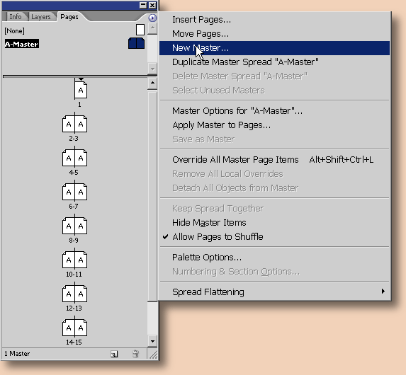 Yhdessä dokumentissa saattaa olla tarpeen, että sivupohjia on monenlaisia. Esimerkikksi jokaisen kappaleen ensimmäinen sivu saattaa noudattaa erilaista asettelua kuin muut sivut. Tällöin luodaan uusi sivupohja. Ensimmäiseksi painetaan oikeassa ylänurkassa olevaa nuolta, jolloin aukeaa seuraavanlainen valikko josta valitaan New Master: