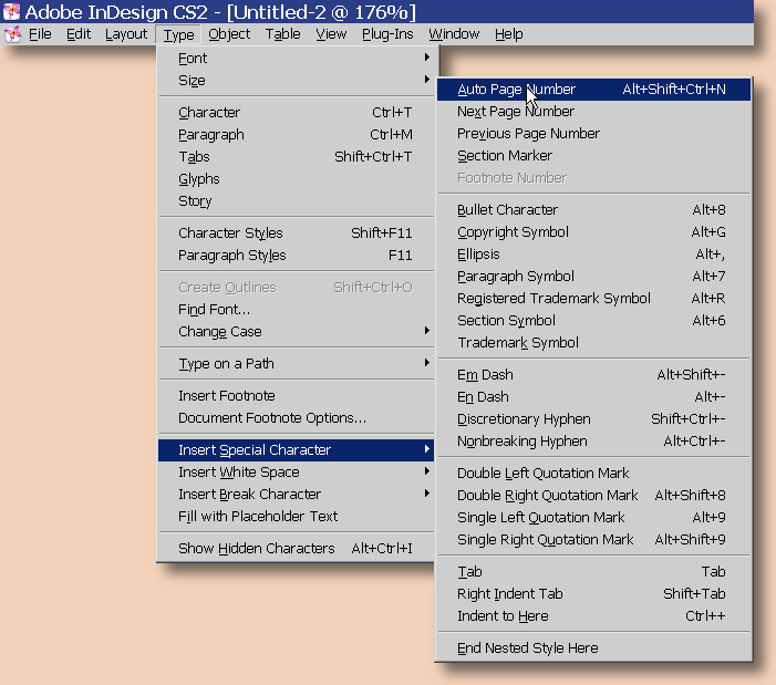 Eräs tärkeä ominaisuus missä sivupohjia käytetään on automaattisten sivunumeroiden lisäämien. Se löytyy valikosta Type --> Insert Special Character --> Auto Page Number: