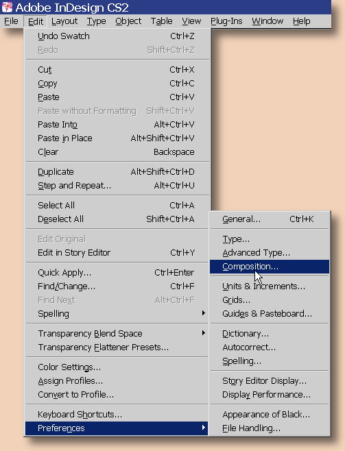 Indesign ei pidä sisällään kovin hyvää suomenkielen tavutusohjelmaa, joten liian väljät ja tiiviit rivit joutuu käsin poistamaan tiedostosta. Kuitenkin käytön helpottamiseksi ohjelma merkitsee liian väljät ja tiiviit rivit keltaisella, jolloin ne on melko helppo poistaa. Jotta ohjelma automaattisesti merkkaisi ongelmarivit, valitse ensin on Edit --> Preferences --> Composition: